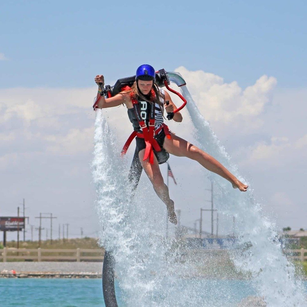 A flyboard jetpack is a thrilling adventure game product that allows you to soar above the water like a superhero. This innovative device is designed to propel you into the air using water pressure, enabling you to experience the sensation of flying without leaving the safety of the water. It comprises a board with bindings that attach to your feet and two powerful jets that shoot water down beneath you. The jets are connected to a high-speed watercraft, which pumps water through a hose and into the flyboard, providing the lift necessary for you to rise into the air. As you gain altitude, you can control your movements by shifting your weight and directing the angle of the jets. This intuitive control system allows you to execute impressive maneuvers, such as spins, flips, and dives, making it an exciting and challenging activity that is sure to get your heart racing