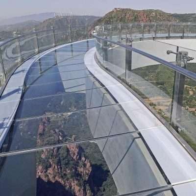 A glass bridge is a type of pedestrian bridge that is made with a glass deck or floor, allowing visitors to see through to the ground or water below. The glass panels are typically made of laminated glass, which consists of two or more layers of glass with a transparent interlayer in between. This construction provides strength and safety to the bridge while still allowing for a clear view of the scenery below.They are popular tourist attractions and are often included in adventure or sightseeing tours. Glass bridges can also be used in urban areas as pedestrian walkways or as a unique design feature in buildings or public spaces.The design and construction of glass bridges require specialized engineering knowledge and careful consideration of safety and durability. They must be able to withstand wind, earthquakes, and heavy foot traffic while still maintaining their transparent qualities.