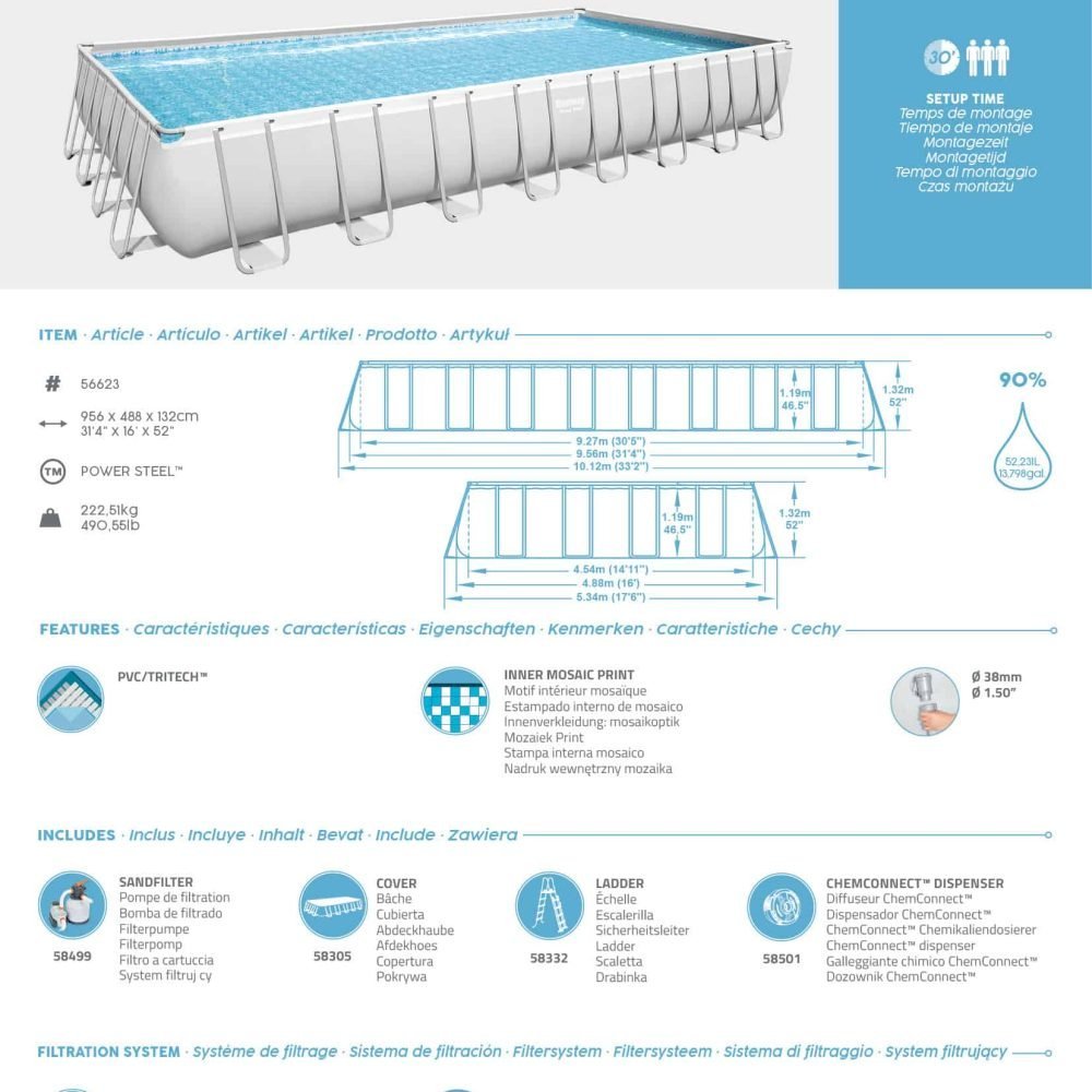 Bestway 56623 | Size 31.4 x 16.0 x 4.33 Ft | Power Steel Rectangular Metal Frame Portable Ready-Made Swimming Pool