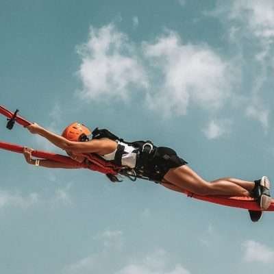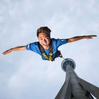 The jump is made with an elastic cord attached to the jumper’s harness, which absorbs the shock of the fall.