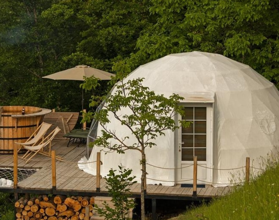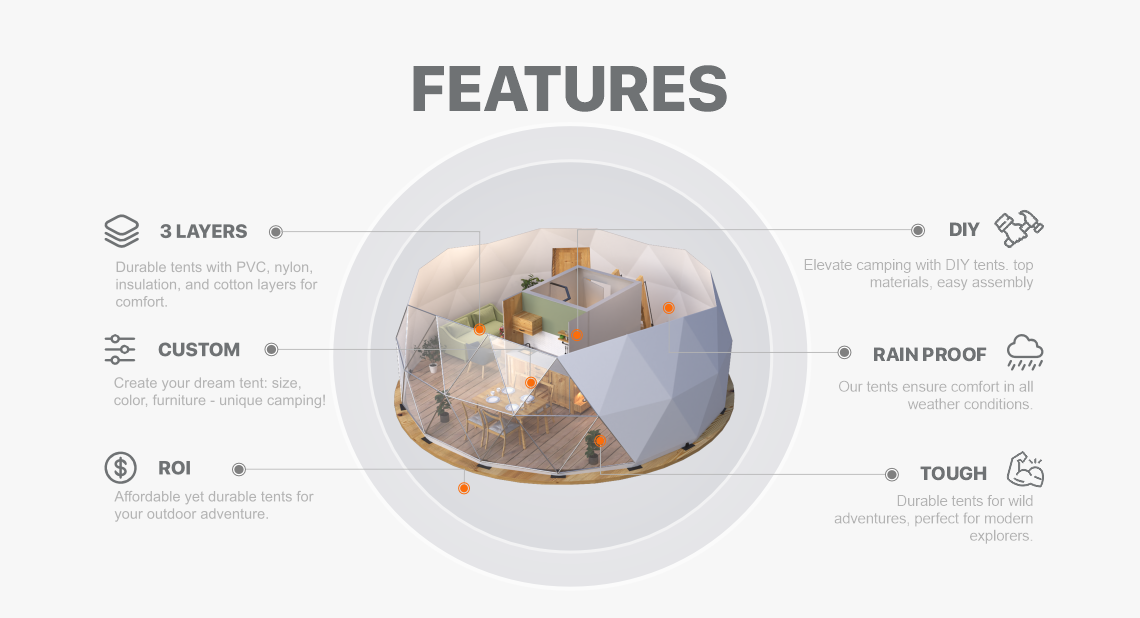 Designed for modern adventurers, our geodesic tents offer ultimate comfort and durability. Crafted from three-layered PVC tarpaulin, this tensile fabric ensures waterproof strength. Stand out with the iconic mushroom design while experiencing quality shelter on your family weekend or outdoor expedition.