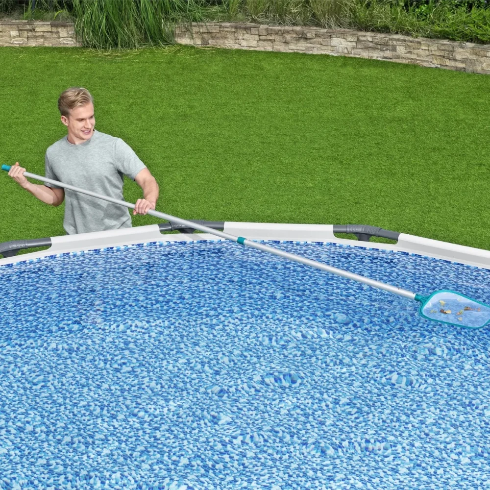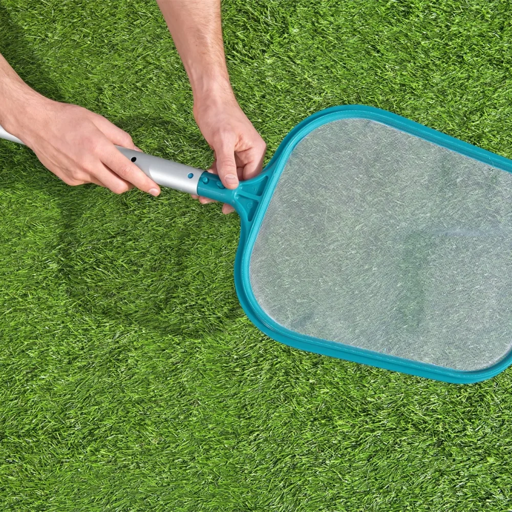 The Bestway® AquaClean™ Pool Maintenance Kit has everything you need to clean the debris out of your pool. This set includes a lightweight pole with interchangeable vacuum and skimmer heads. The skimmer will scoop up leaves while the vacuum will suck up algae, debris and grime. Connecting the different heads to the pole is easy, no tools required! Using the included hose, simply attach the vacuum to your filter pump for suction and easily clear away the debris from the bottom of your pool into the reusable debris bag. The maintenance kit is compatible with filter pumps with 530 gal./h (2,006 L/h) flow rate or higher, and is great for use with above ground pools up to 20 ft. (6.10 m) in diameter. Plus, the kit even includes an adapter to be used with skimmer style filter pumps. The Bestway AquaClean Pool Maintenance Kit has everything you need to make cleaning the debris out of your pool a breeze!